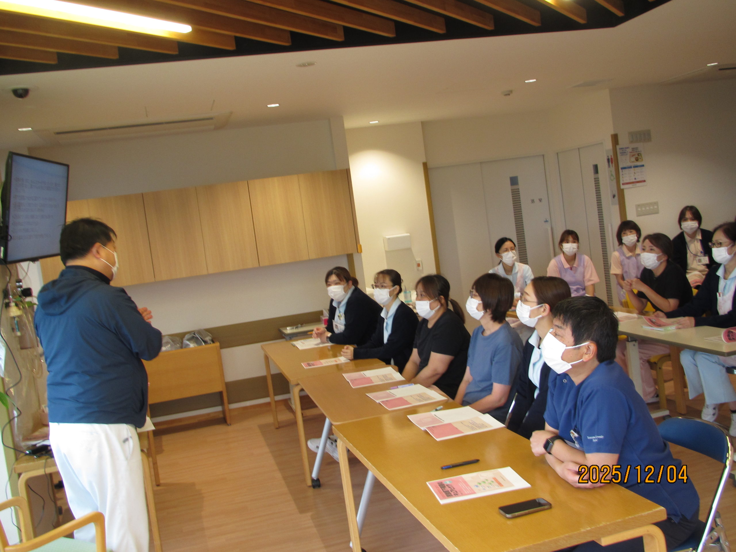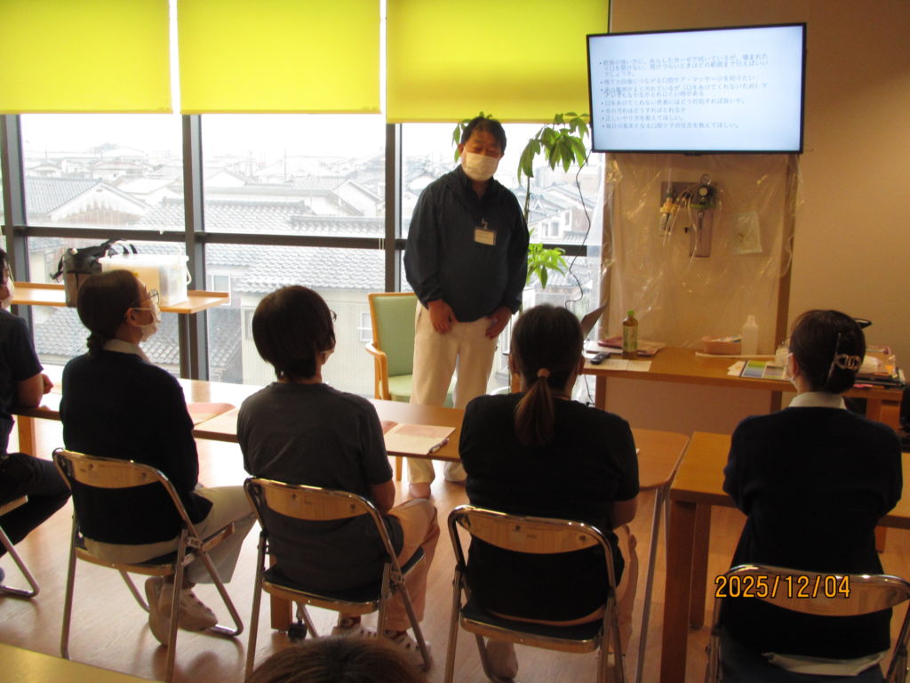 第5回 口腔衛生に関する研修を行いました 12月4日(木)15:00~ 第5回 口腔衛生に関する研修を行いました。 (参加者18名) 米森 誠先生より「摂食嚥下障害のキュアとケア」について講義していただき、漫然と口腔ケアを行うのではなく、個々に応じた目標設定と評価を行い目標達成に必要なケアを行うことが大切だと感じました。 前回当院入所中の利用者の口腔ケアについてアドバイスをいただき実践したところ、一旦改善したものの脱感作がみられたため今後の課題となりました。